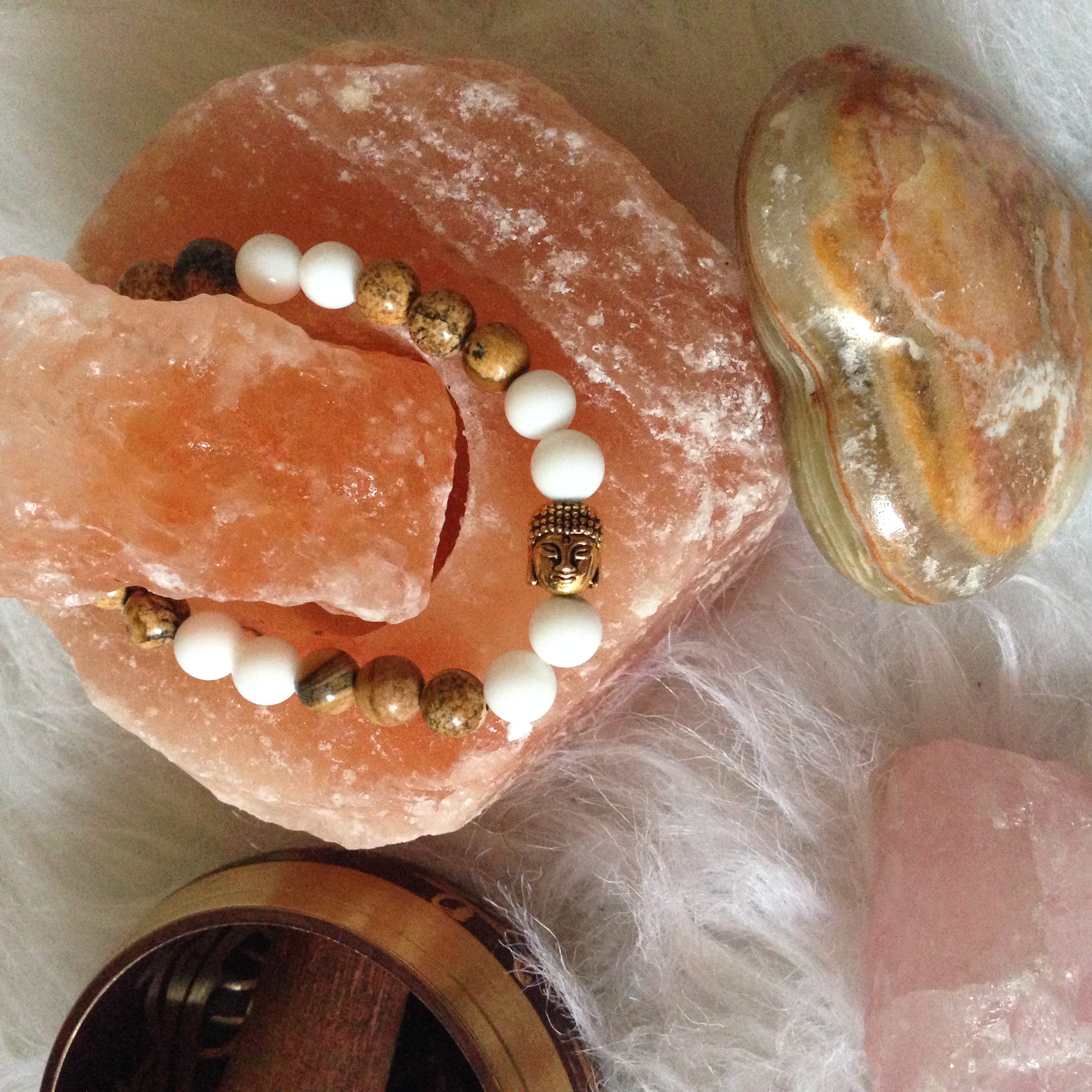 A handmade natural stone bracelet made by yours truly. This specific bracelet consists of the lovely picture jasper and White Coral beads. With a Copper Buddha charm for a constant reminder to always be present.